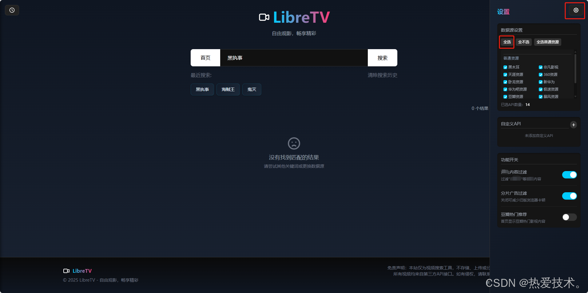 他这边说搜不到资源,别担心,点击右上角的设置按钮,可以将上面数据源都勾选上。