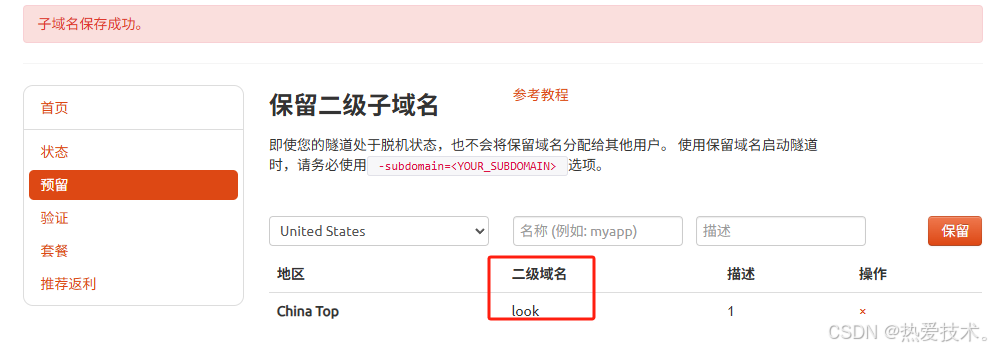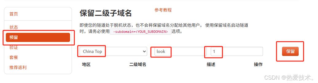 点击左侧的预留,选择保留二级子域名,地区选择china top,然后设置一个二级子域名名称,我这里演示使用的是look,大家可以自定义。填写备注信息,点击保留。
