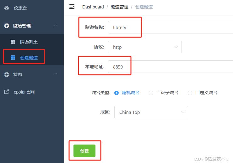 - 隧道名称:可自定义,本例使用了:libretv,注意不要与已有的隧道名称重复