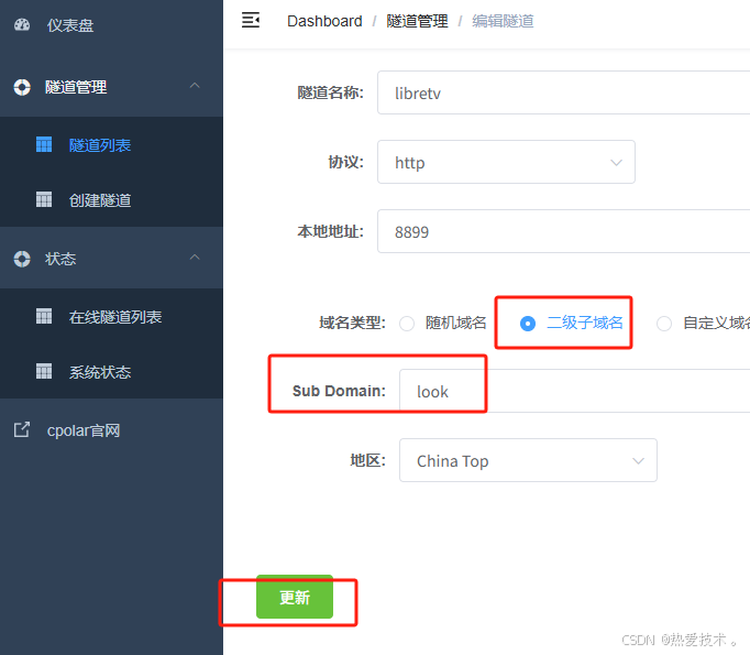 修改隧道信息,将保留成功的二级子域名配置到隧道中