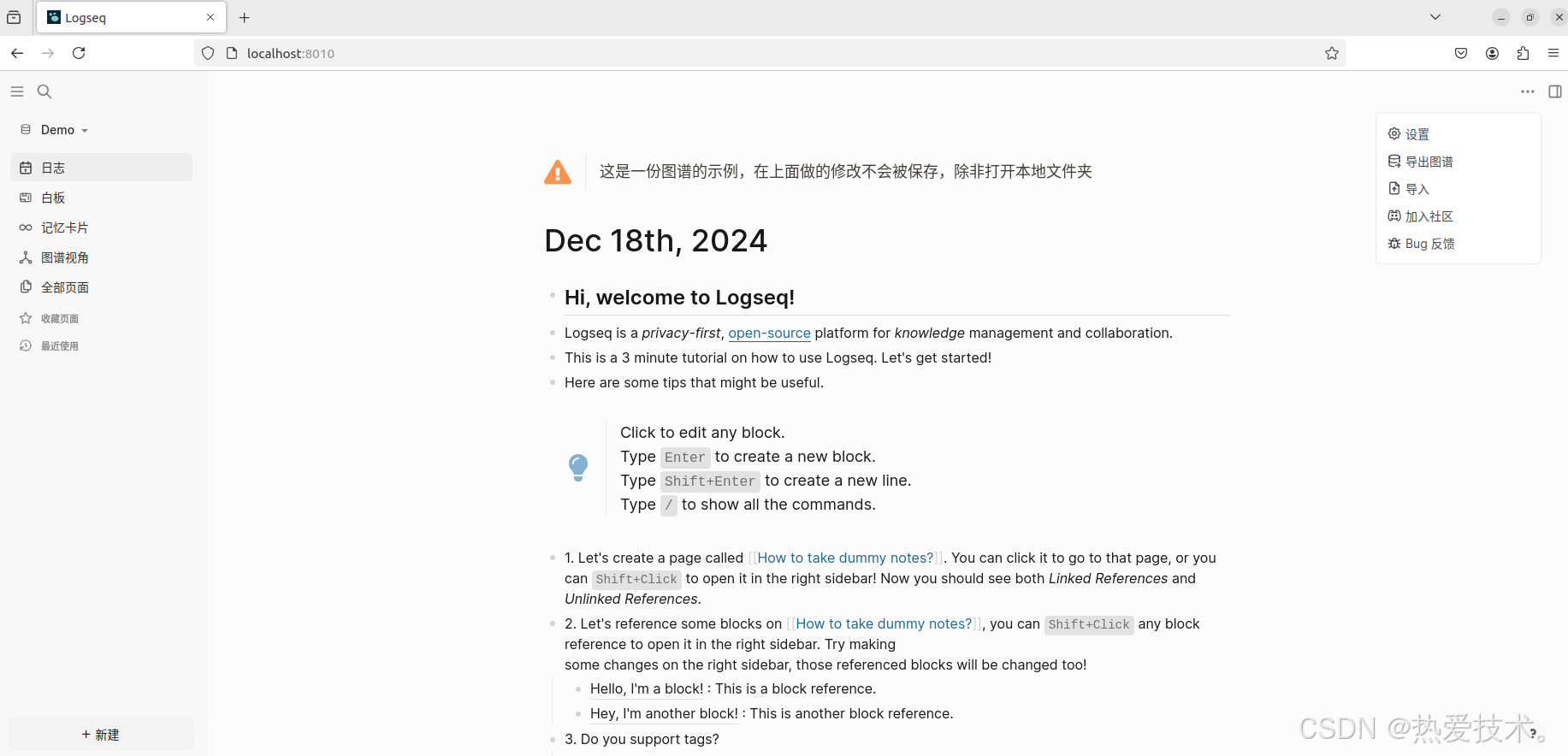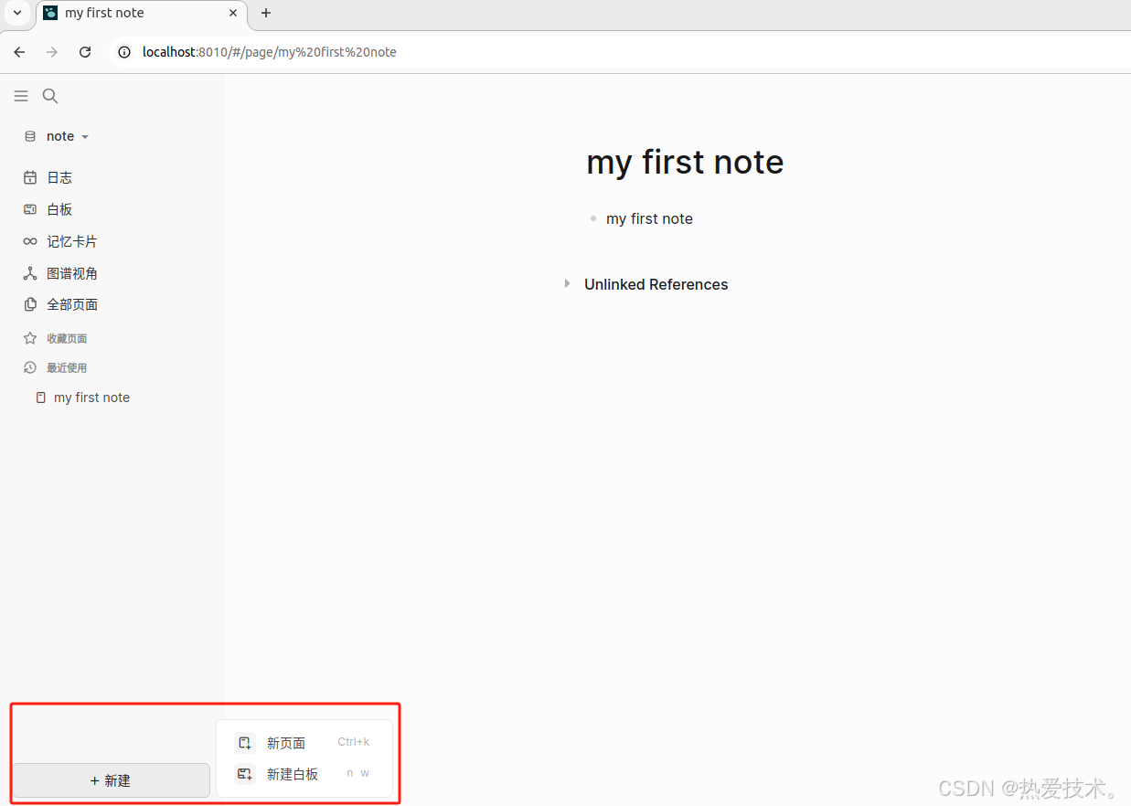 现在就已经部署完毕了,打开Web浏览器输入localhost:8010,就可以访问到Logseq笔记的web页面了。