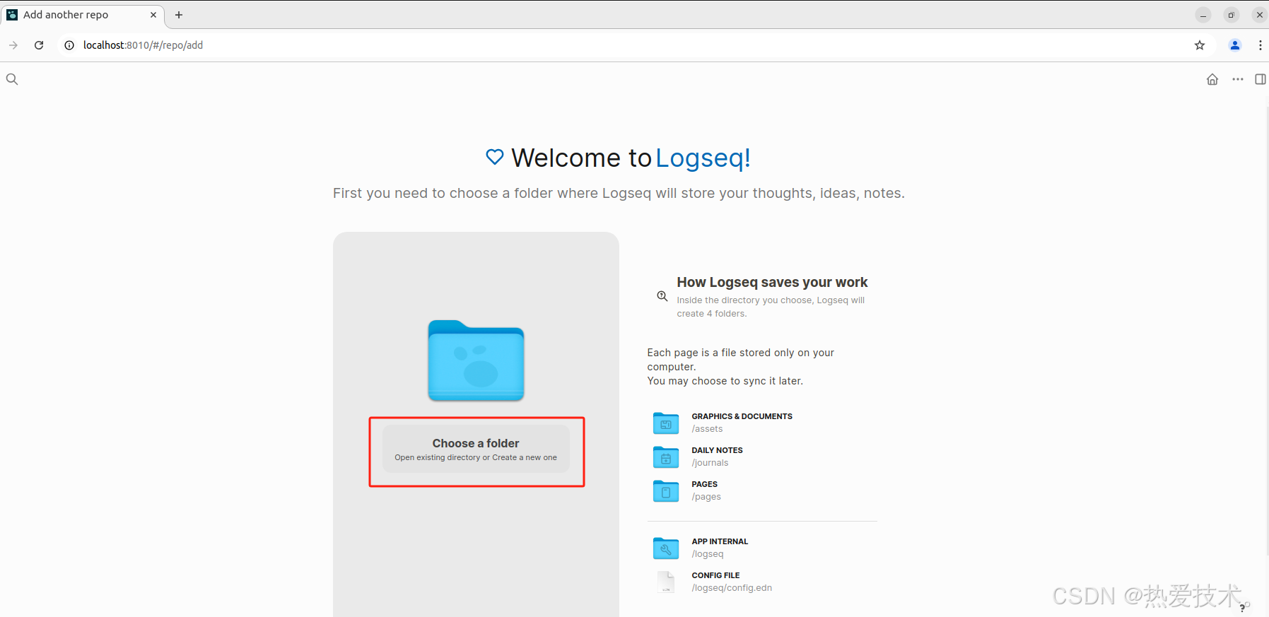 作为一款超好用的笔记软件,Logseq支持大纲,双向链接,本地存储。想要开始使用笔记,我们首先需要设置本地文件夹用来存储笔记。不同的浏览器因为兼容问题可能识别不到创建按钮,我这里使用的是谷歌浏览器,可以正常显示,点击右上角的添加图谱,跳转后点击`Choose a folder` ,然后选择本地用来保存笔记的文件夹即可。