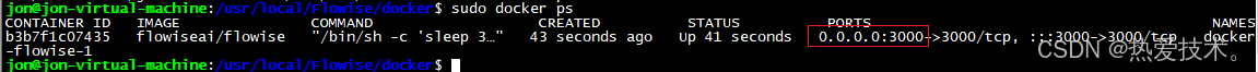 运行后.执行`sudo docker ps`命令,我们可以看到Flowise成功运行了,且注意,访问端口是3000,下面我们在Linux 或者局域网去访问3000端口