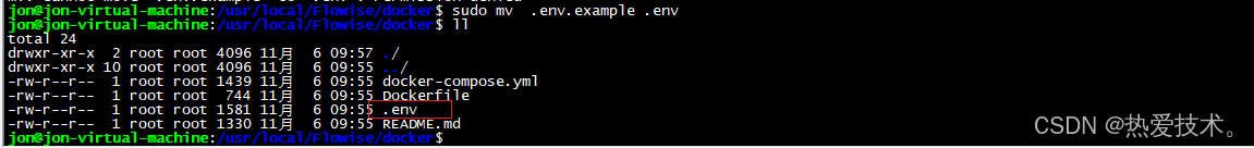 官方默认一个.env.example配置文件,我们直接修改成.env使用即可,注意,要进入Flowise文件里的docker文件夹,执行