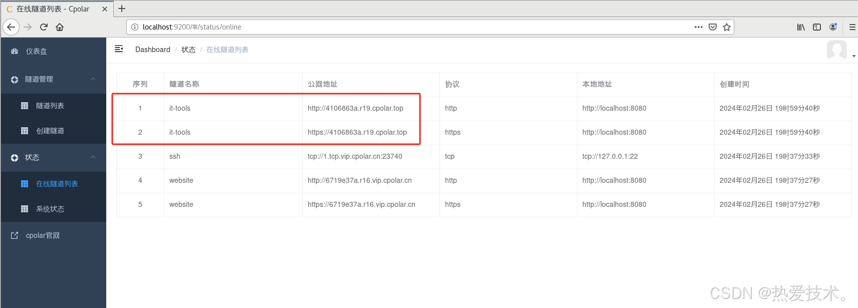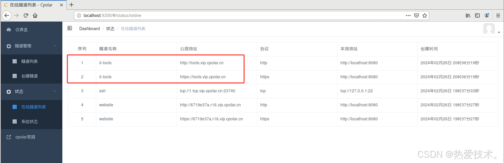 隧道创建成功后,点击左侧的状态——在线隧道列表,查看所生成的公网访问地址,有两种访问方式,一种是http 和https