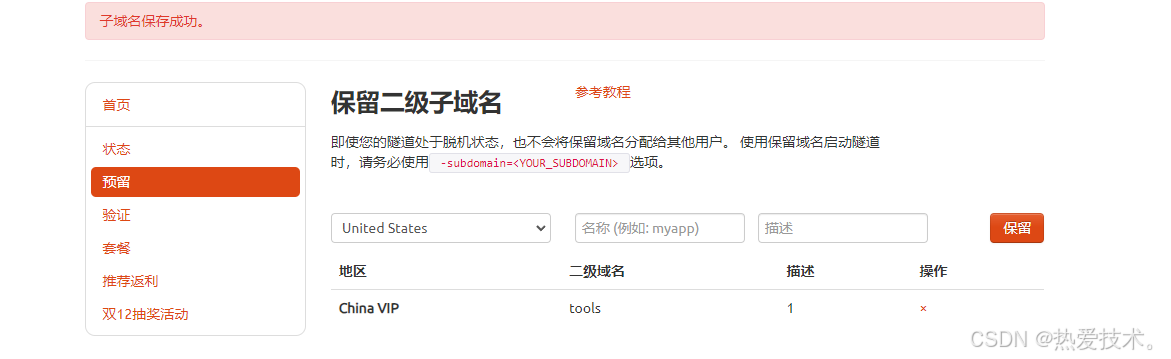 [登录cpolar官网](https://dashboard.cpolar.com/),点击左侧的预留,选择保留二级子域名,设置一个二级子域名名称,点击保留,保留成功后复制保留的二级子域名名称