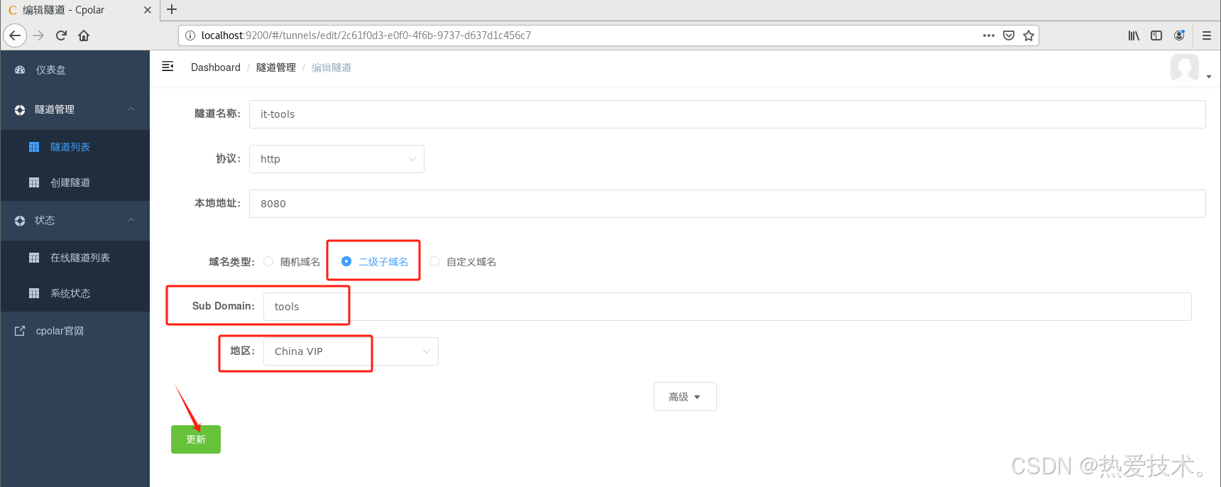 修改隧道信息,将保留成功的二级子域名配置到隧道中