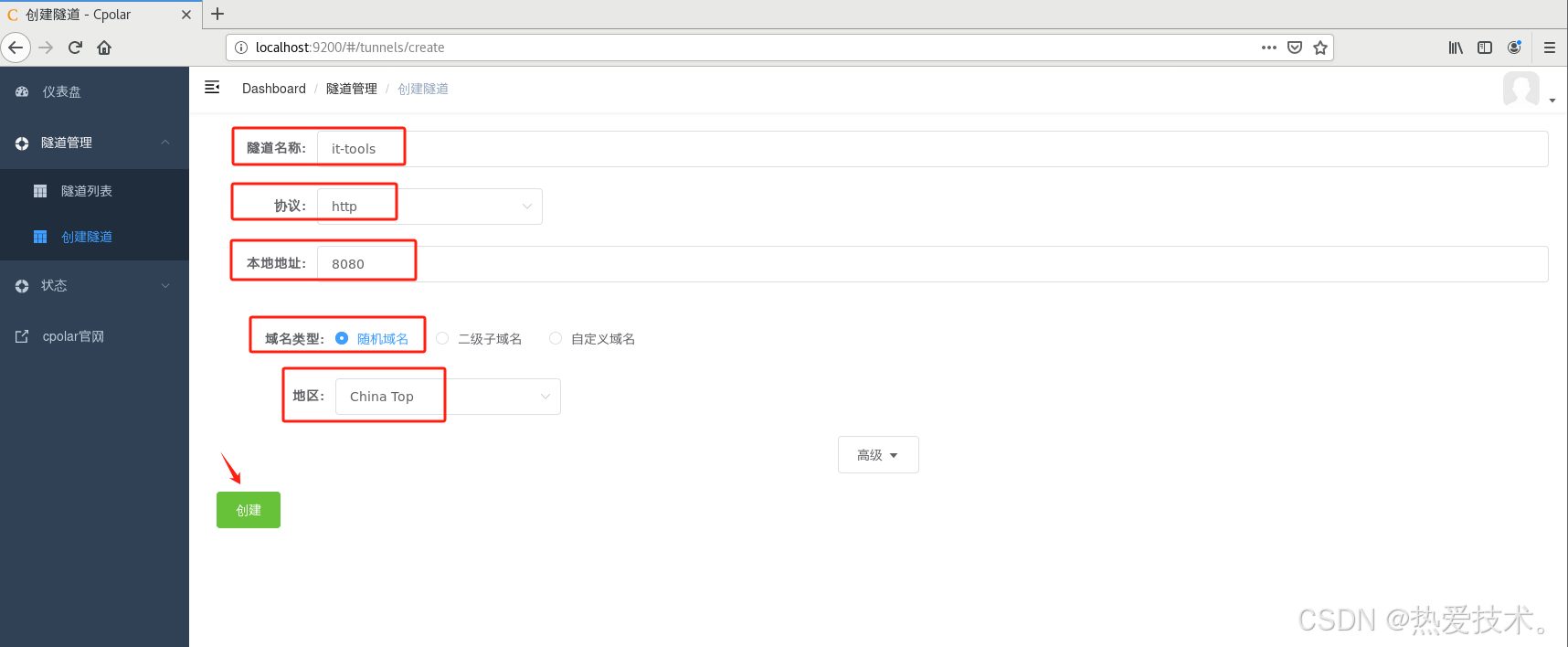 登录后,点击左侧仪表盘的隧道管理——创建隧道,
