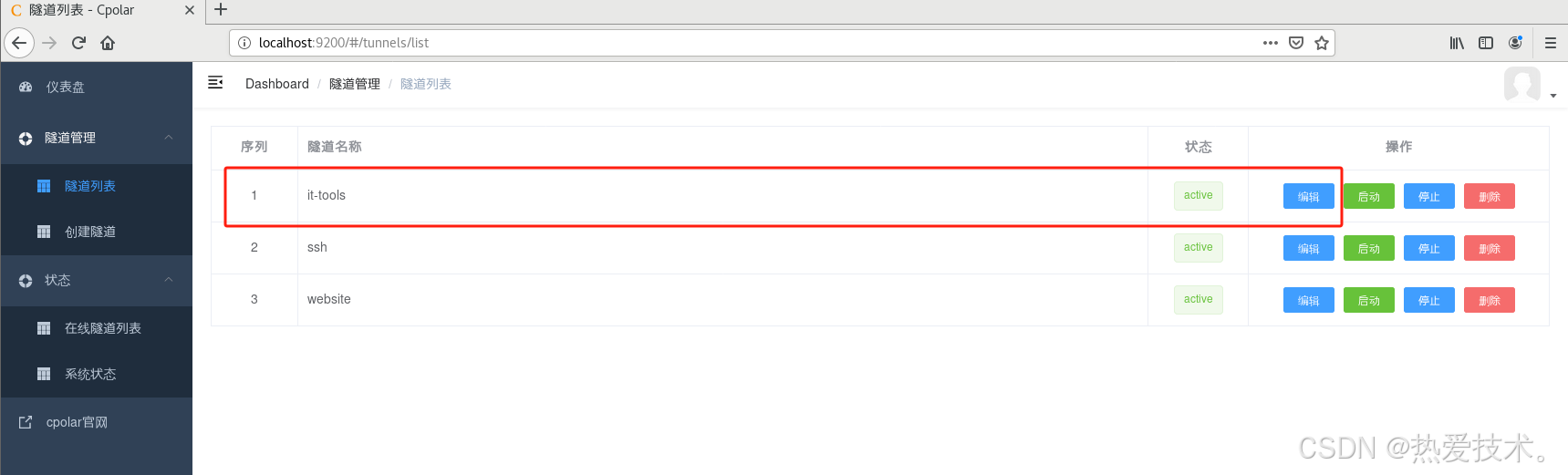 返回登录Cpolar web UI管理界面,点击左侧仪表盘的隧道管理——隧道列表,找到所要配置的隧道,点击右侧的编辑