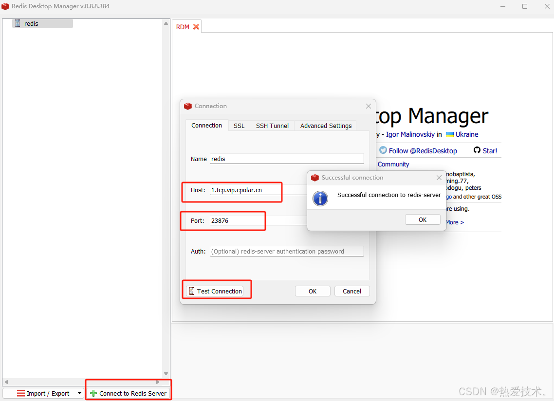 输入后点击连接测试,如看到弹出框提示成功连接,即本地连接redis测试成功。