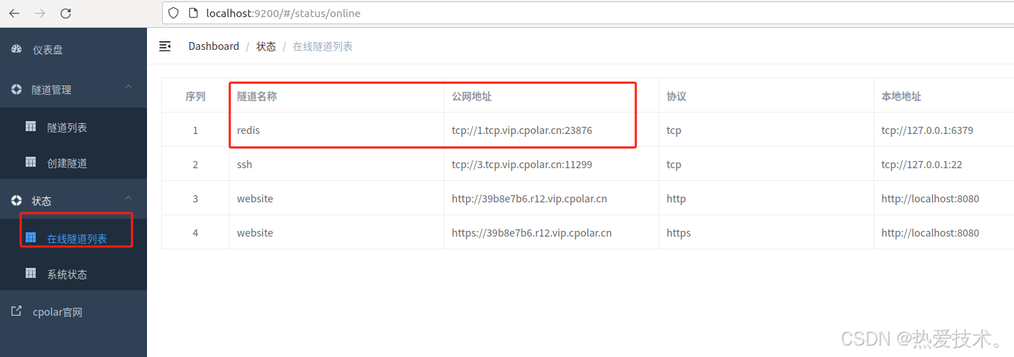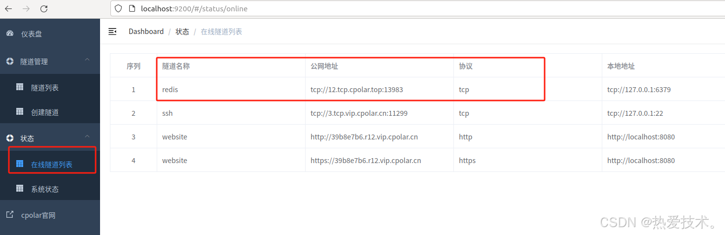 创建成功后,打开左侧在线隧道列表,可以看到刚刚通过创建隧道生成了公网地址,接下来就可以在其他电脑(异地)上,将该地址与端口号分别复制到Redis Desktop Manager访问即可。