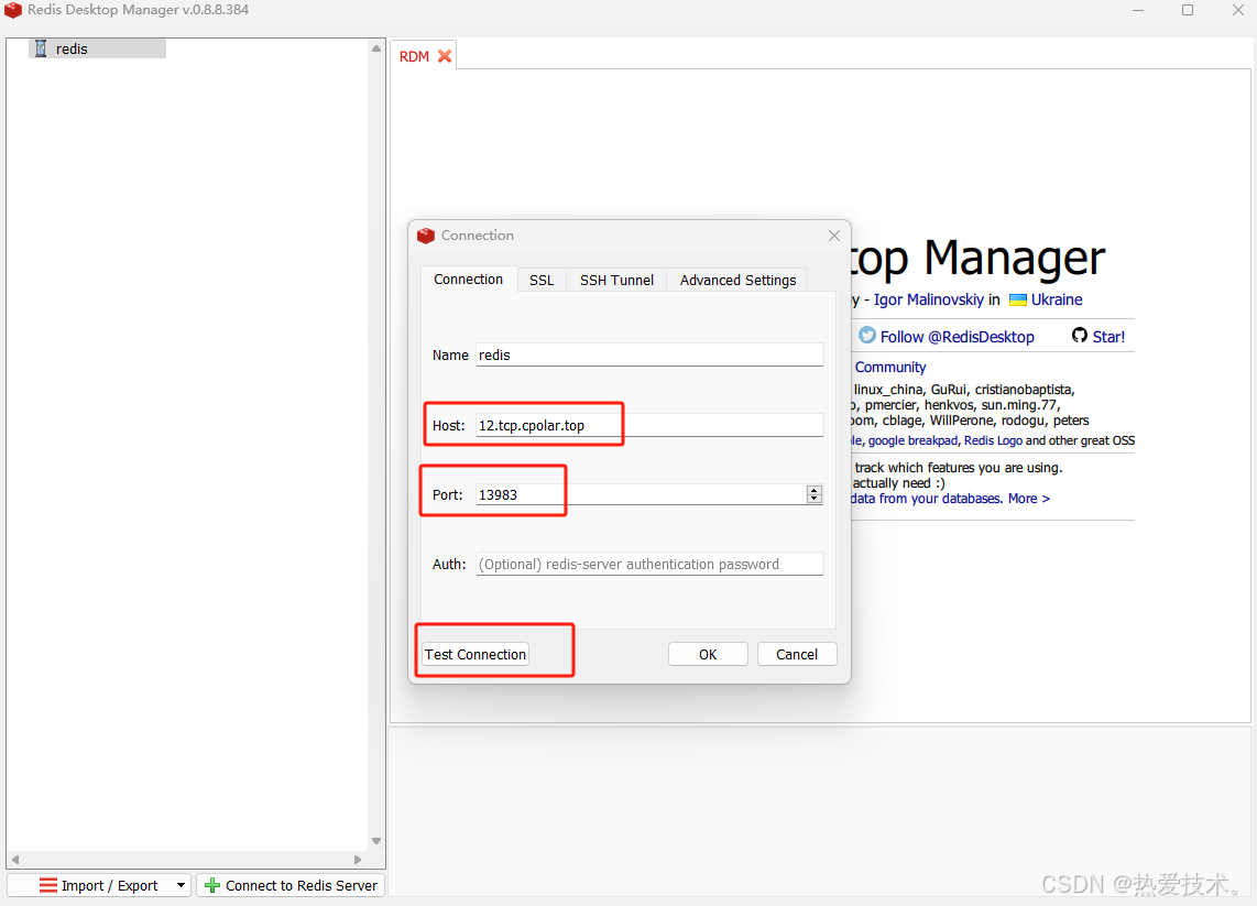在弹出的窗口中,需要填入本机ip地址和redis的端口号: