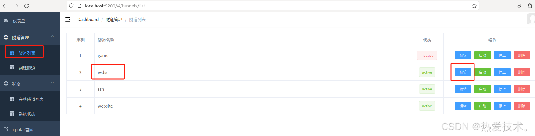 地址保留成功后,复制生成的公网地址,打开cpolar web ui管理界面,点击左侧仪表盘的隧道管理——隧道列表,找到我们刚才创建的随机公网地址隧道 **redis**,点击`编辑`