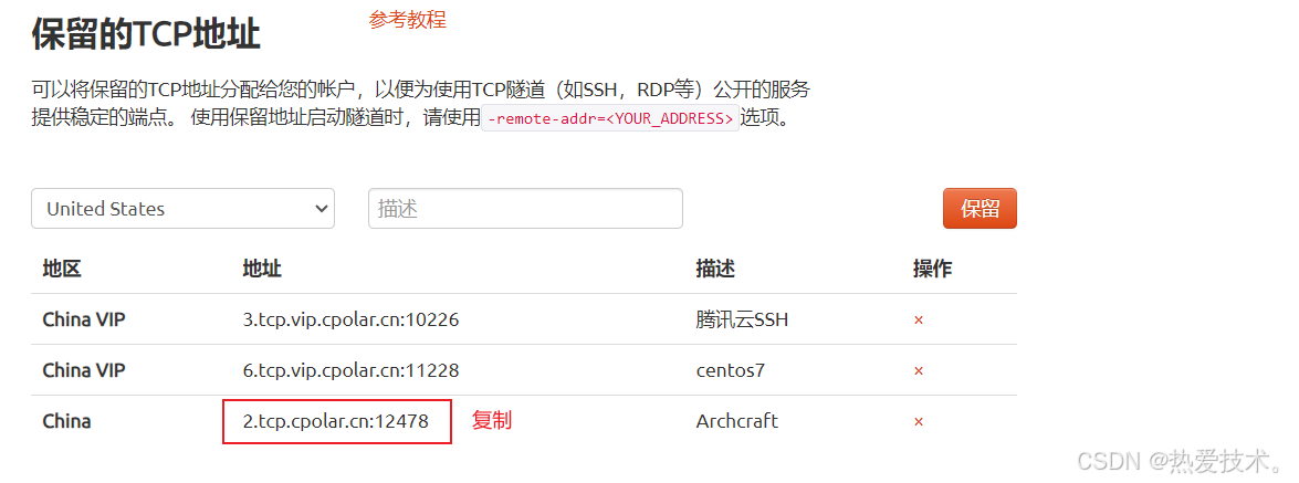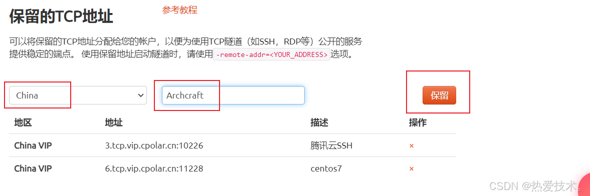 以上步骤使用的是随机临时tcp端口地址,所生成的公网地址为随机临时地址,该公网地址24小时内会随机变化。我们接下来为其配置固定的TCP端口地址,该地址不会变化,设置后将无需每天重复修改地址。
