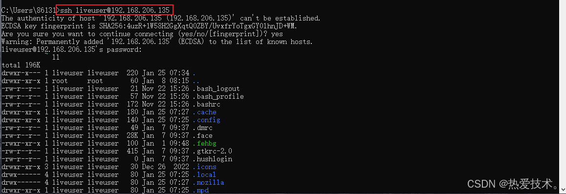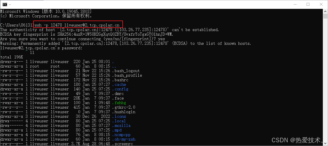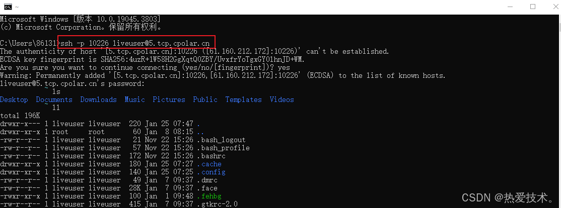 上面在cpolar中创建了ssh 的 公网地址,接下来我们在其他设备上使用公网地址进行ssh 远程连接测试,在Windows 系统命令行进行连接测试,按照ssh 格式输入命令后,可以看到连接成功,执行命令可以列出相关目录!
