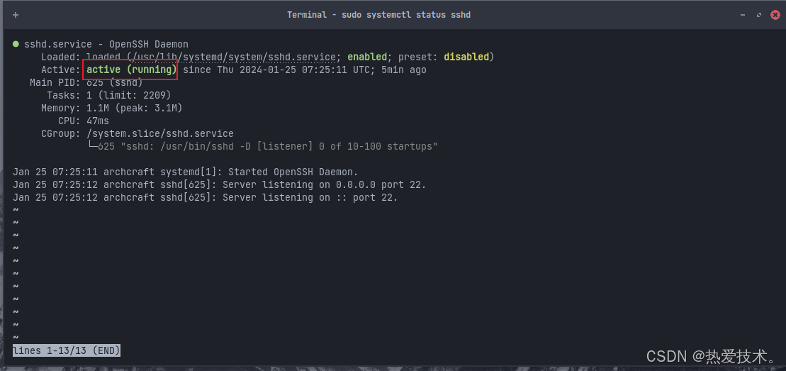 首先检查ssh 服务运行状态,输入`sudo systemctl status sshd`查看运行状态,active表示运行正常