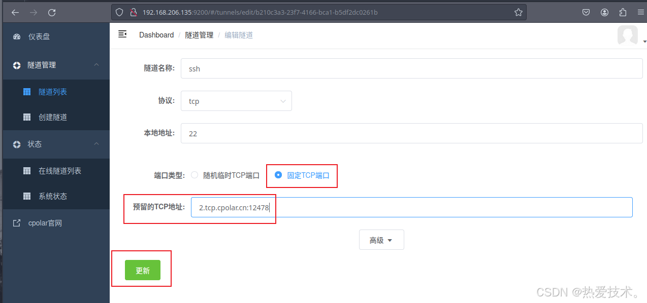修改隧道信息,将保留成功的固定tcp地址配置到隧道中