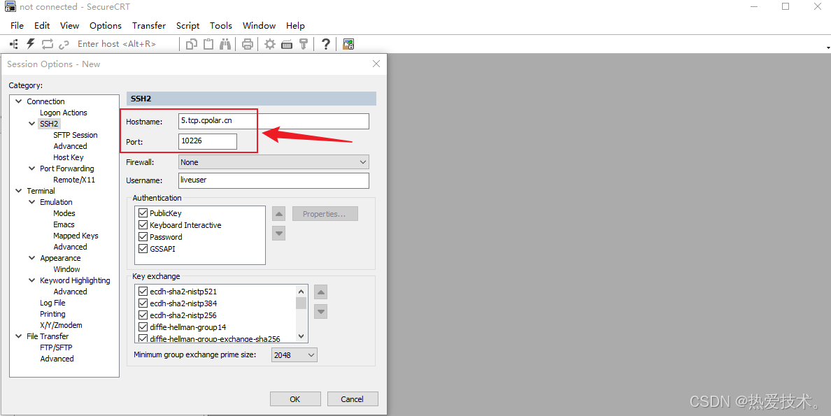 同样我们使用ssh 连接工具,也可以正常连接,在工具中输入cpolar tcp 公网地址.以Secure CRT为例