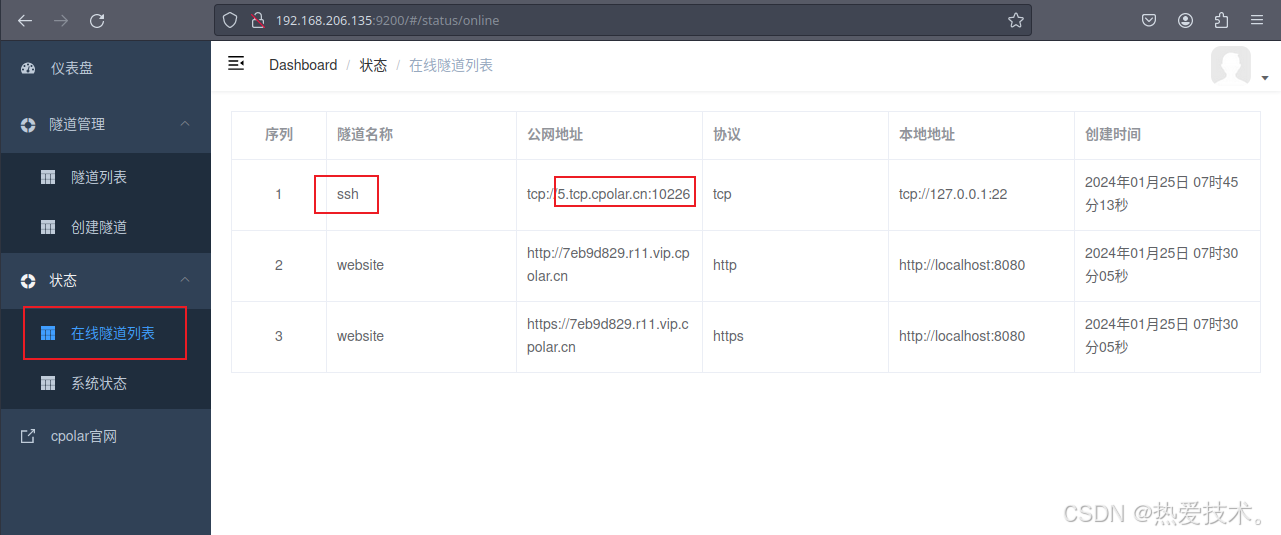 然后打开左侧在线隧道列表,查看刚刚创建隧道后生成的 ssh TCP连接的地址,这个地址就是公网连接地址,我们可以在任意设备上使用该地址进行ssh 连接