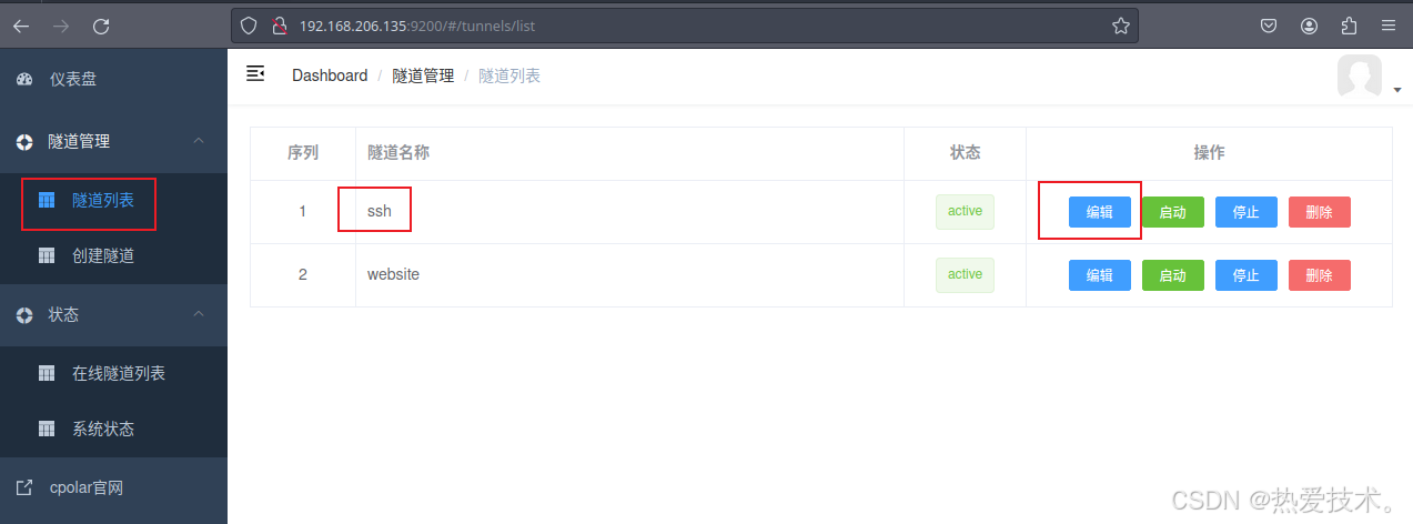 再次打开cpolar web ui管理界面,点击左侧仪表盘的隧道管理——隧道列表,找到我们上面创建的TCP隧道,点击右侧的`编辑`