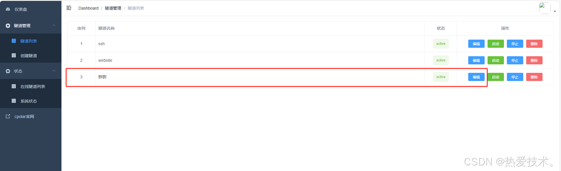 返回登录Cpolar web UI管理界面,点击左侧仪表盘的隧道管理——隧道列表,找到所要配置的隧道 `群晖`,点击右侧的编辑:
