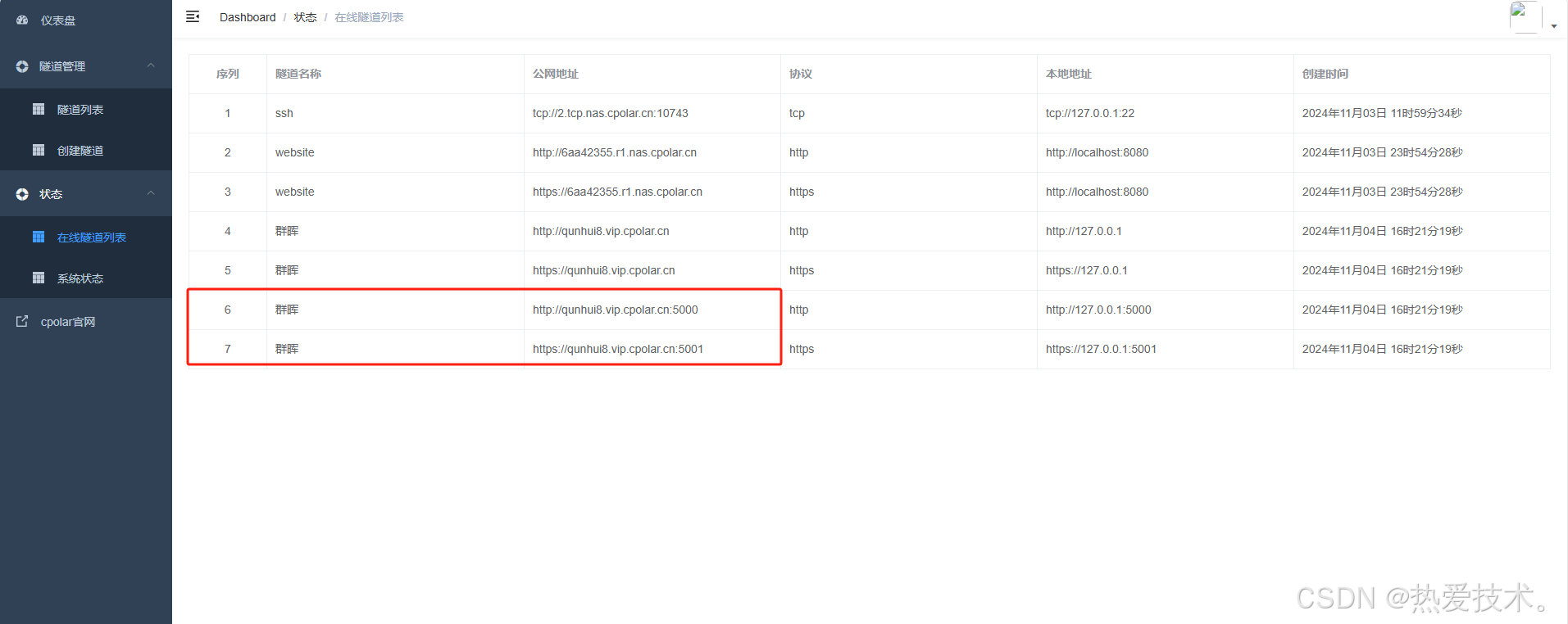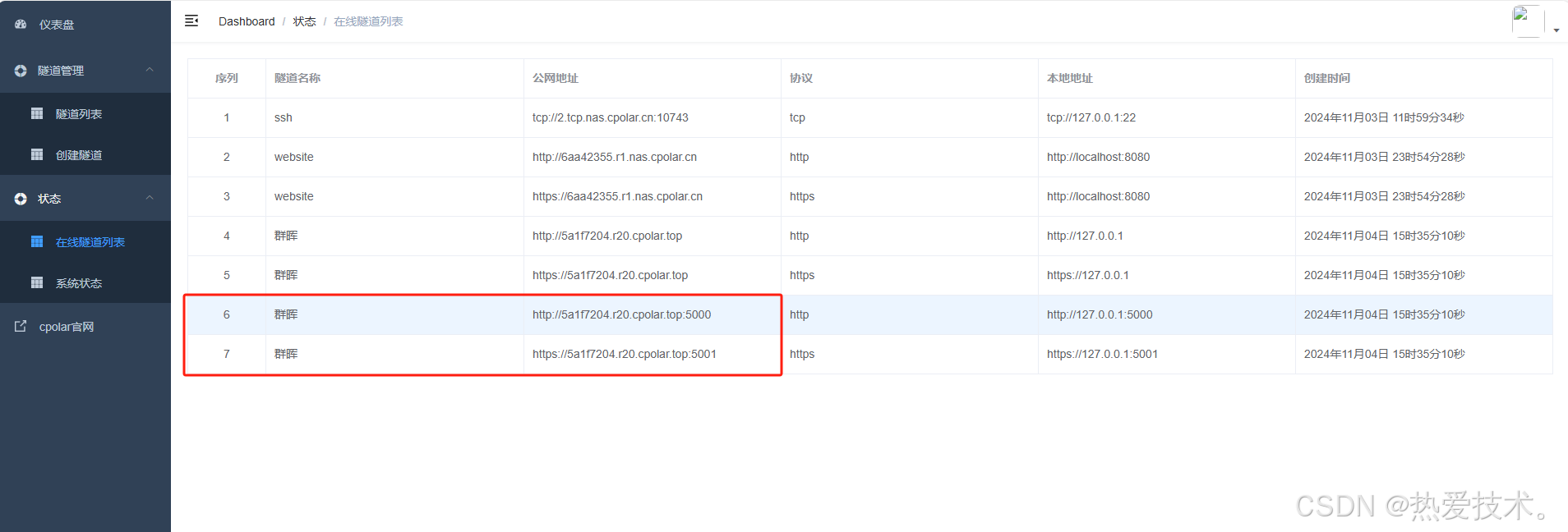 然后打开在线隧道列表,查看群晖生成了四个公网地址,复制5000和5001这两个公网地址