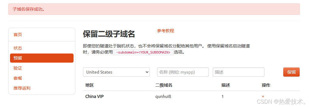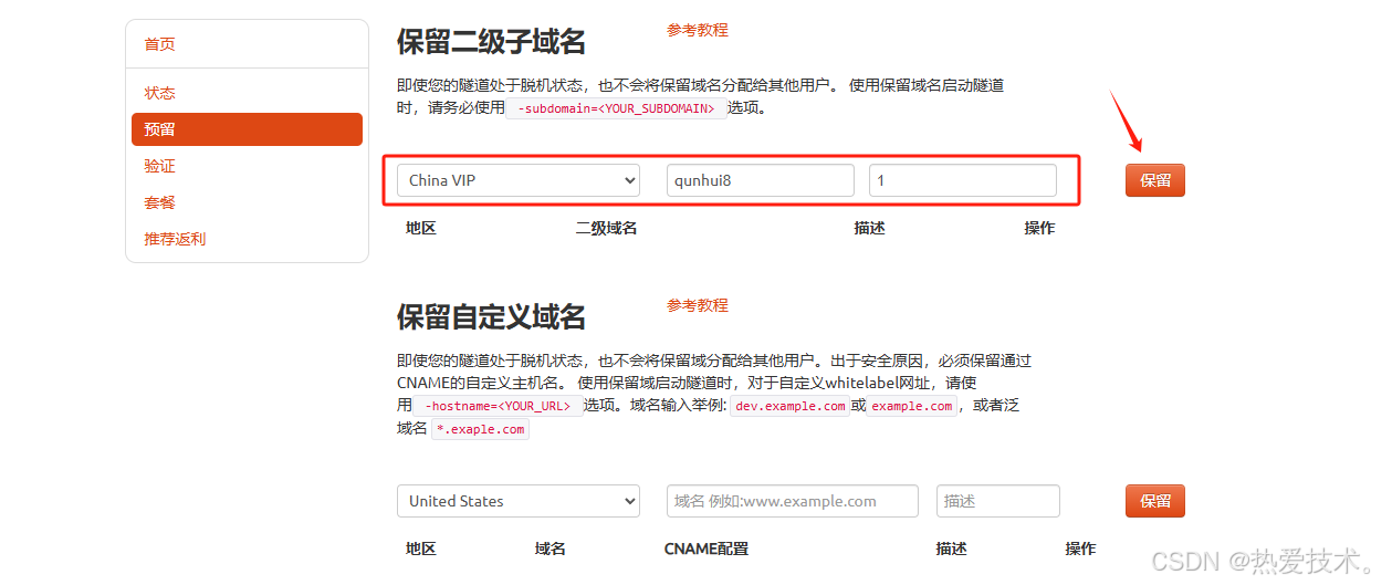 [登录cpolar官网](https://dashboard.cpolar.com/login),点击左侧的预留,选择保留二级子域名,地区选择China VIP,设置一个二级子域名名称,点击保留,保留成功后复制保留的二级子域名名称。