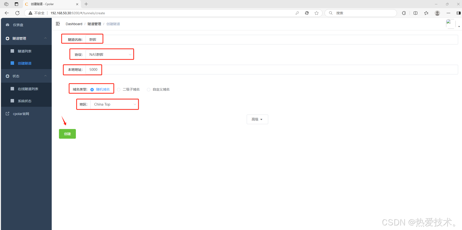 登录成功后,点击左侧仪表盘的隧道管理——创建隧道: