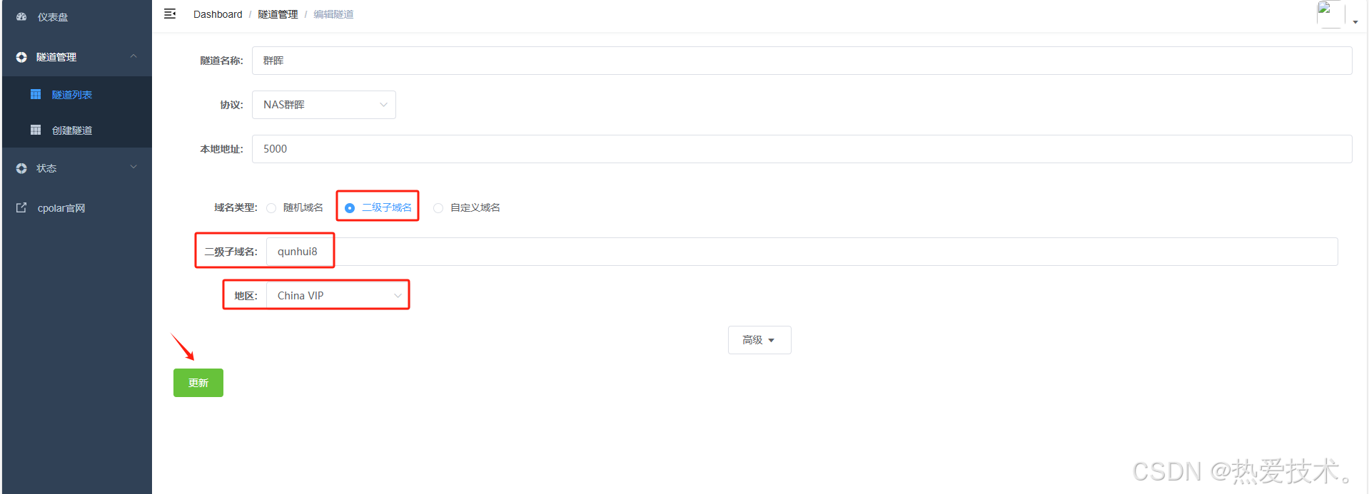 修改隧道信息,将保留成功的二级子域名配置到隧道中