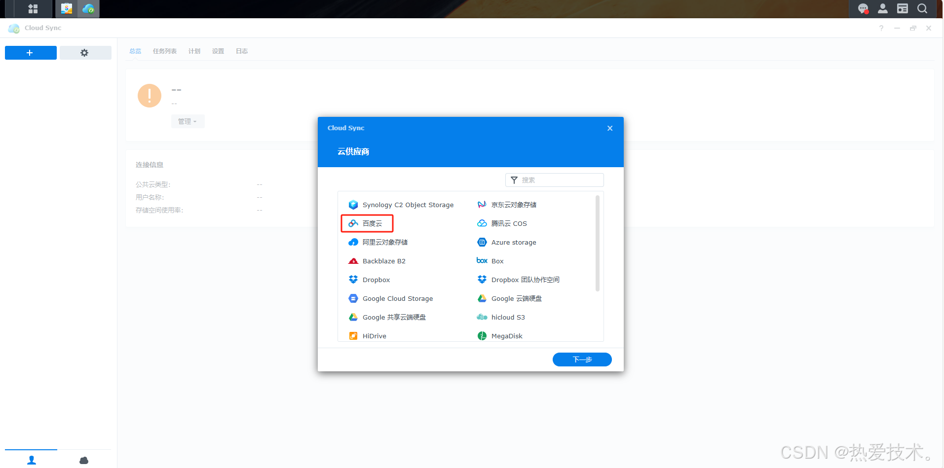 Cloud Sync 是群晖 NAS 上的一款套件,主要功能是实现 NAS 与各类云存储服务(如百度云、OneDrive 等)的双向同步,能将分散在不同云端的文件集中管理,也能让 NAS 里的文件同步到云端,方便文件备份和管理。适合有大量文件需要跨平台同步的个人和企业用户。