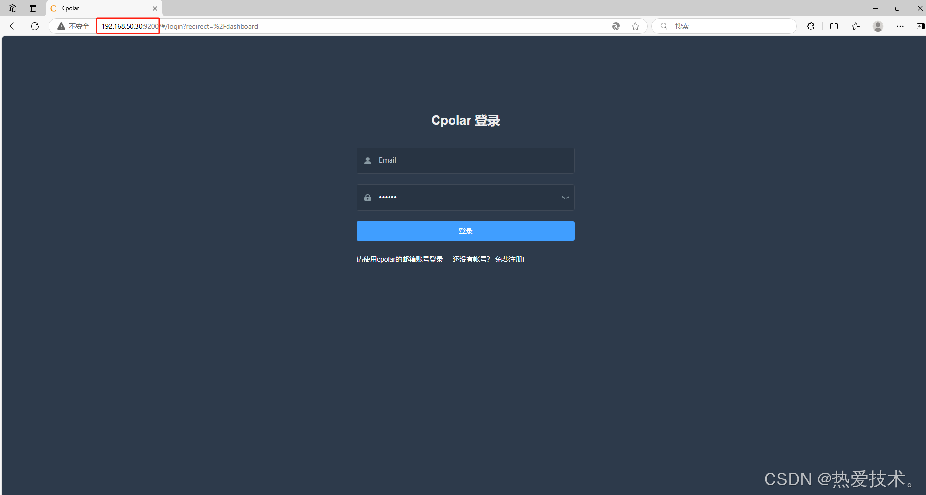 在外部浏览器,我们通过`群晖的局域网ip地址`加`9200`端口,cpolar的Web管理界面,默认端口为9200,输入cpolar邮箱账号与密码进行登录