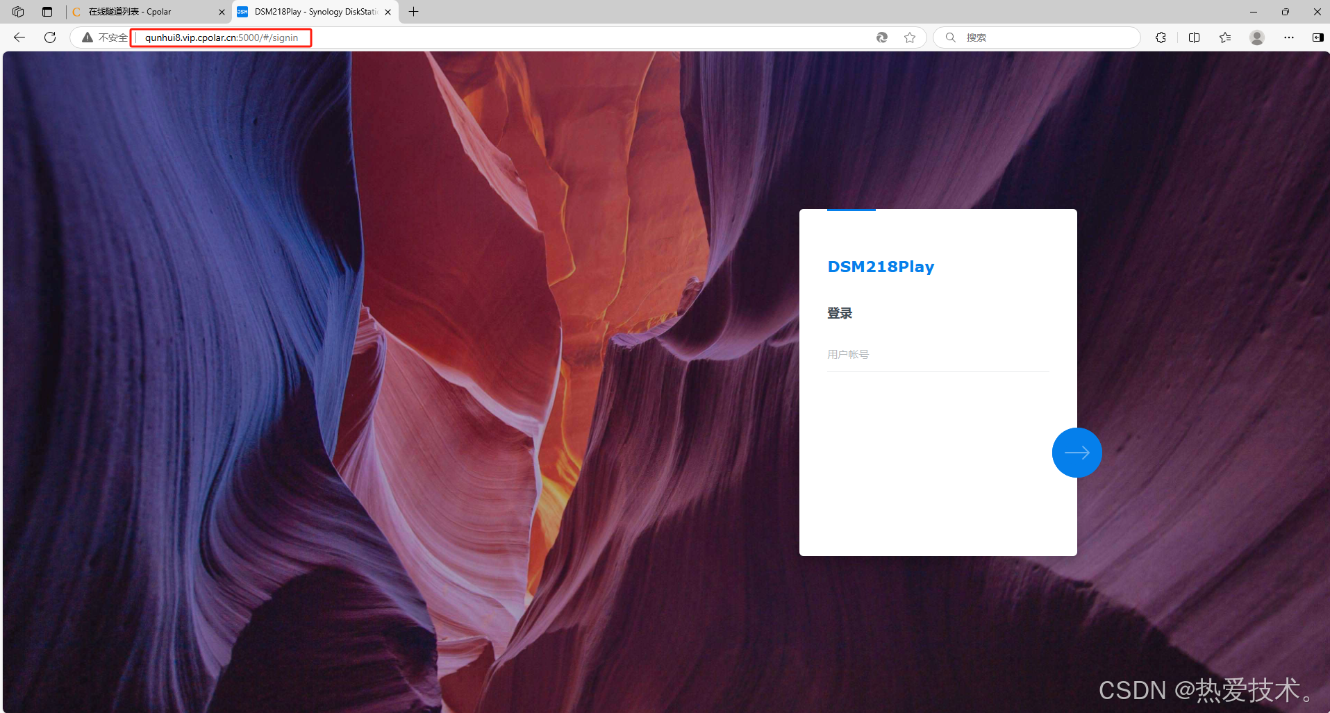使用任意一个固定公网地址在浏览器访问,可以看到访问成功,这样一个固定且永久不变的公网地址就设置好了,随时随地都可以远程访问本地局域网内的群晖及群晖Cloud Sync套件了!