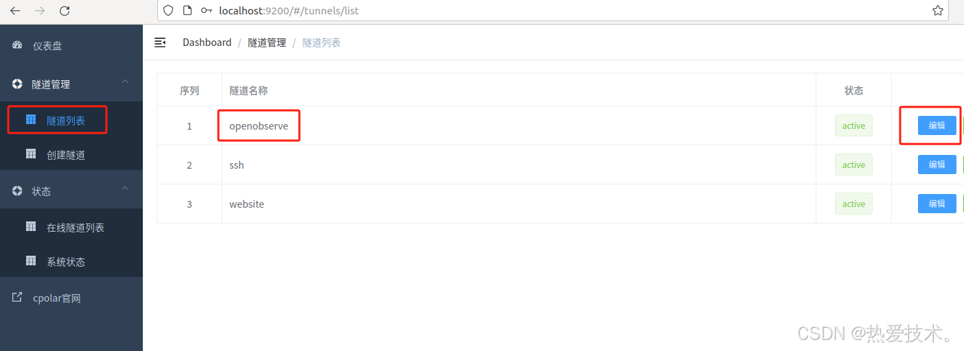 保留成功后复制保留成功的二级子域名的名称:myoo1,返回登录Cpolar web UI管理界面,点击左侧仪表盘的隧道管理——隧道列表,找到所要配置的隧道OpenObserve,点击右侧的编辑: