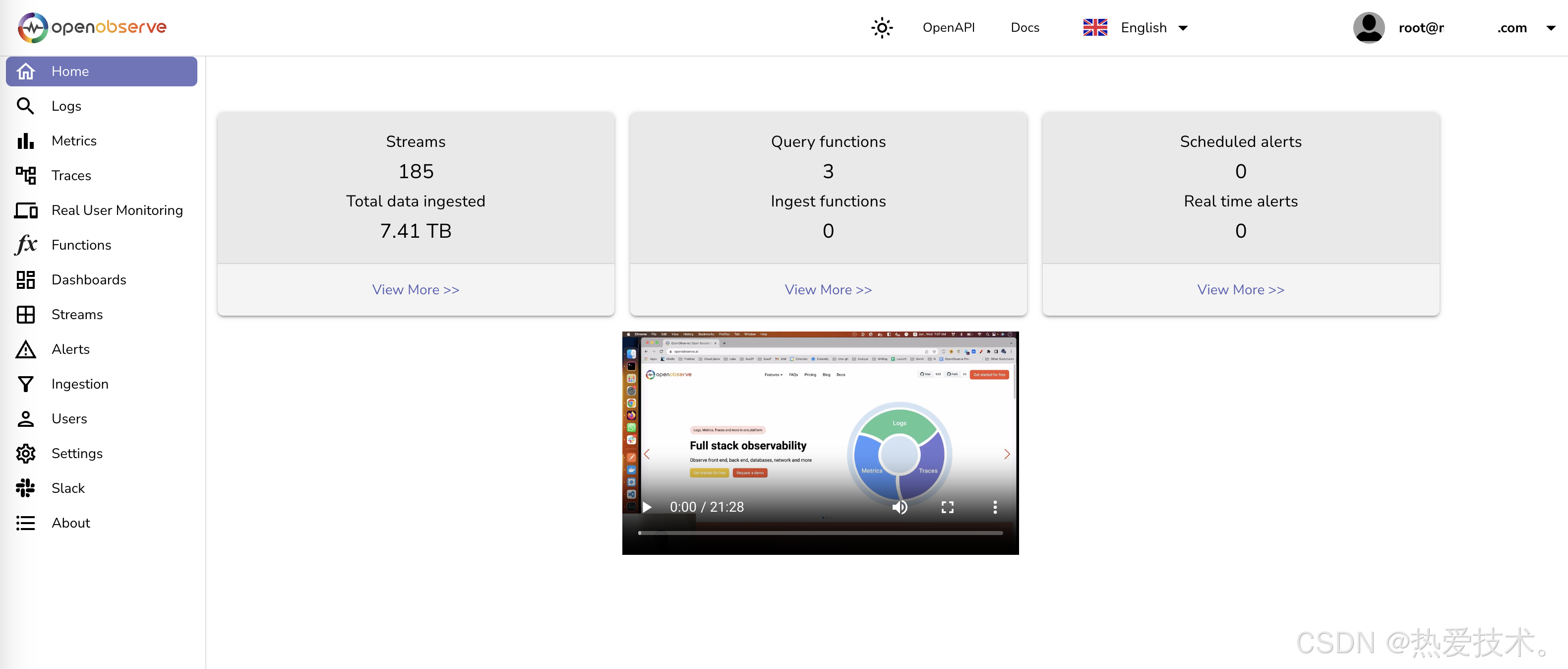 OpenObserve 主要用于企业监控架构,可收集、分析日志、性能等数据,提供统一查询接口和可视化仪表盘,帮助团队实时掌握系统运行状态,是监控数据管理的实用工具。