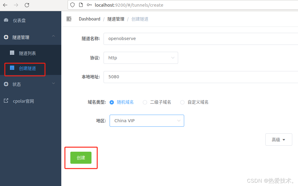 - 隧道名称:可自定义,本例使用了:OpenObserve 注意不要与已有的隧道名称重复