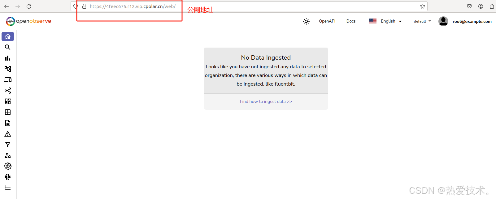最后,我们使用任意一个固定公网地址在浏览器访问,可以看到访问成功,这样一个固定且永久不变的二级子域名公网地址就设置好了,随时随地都可以远程访问本地部署的 openobserve 平台来观测数据了。