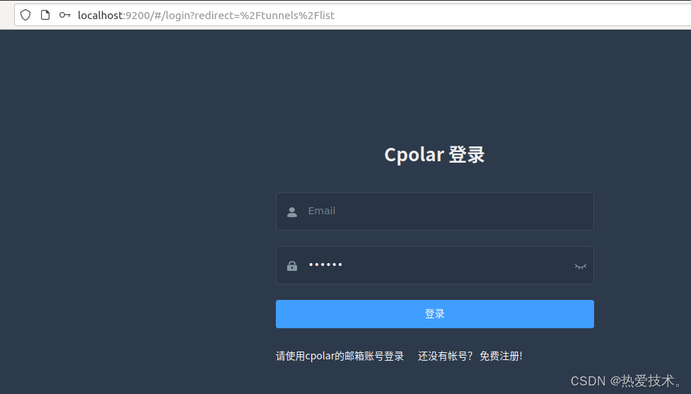 Cpolar安装和成功启动服务后,在浏览器上输入ubuntu主机IP加9200端口即:【http://localhost:9200】访问Cpolar管理界面,使用Cpolar官网注册的账号登录,登录后即可看到cpolar web 配置界面,接下来在web 界面配置即可: