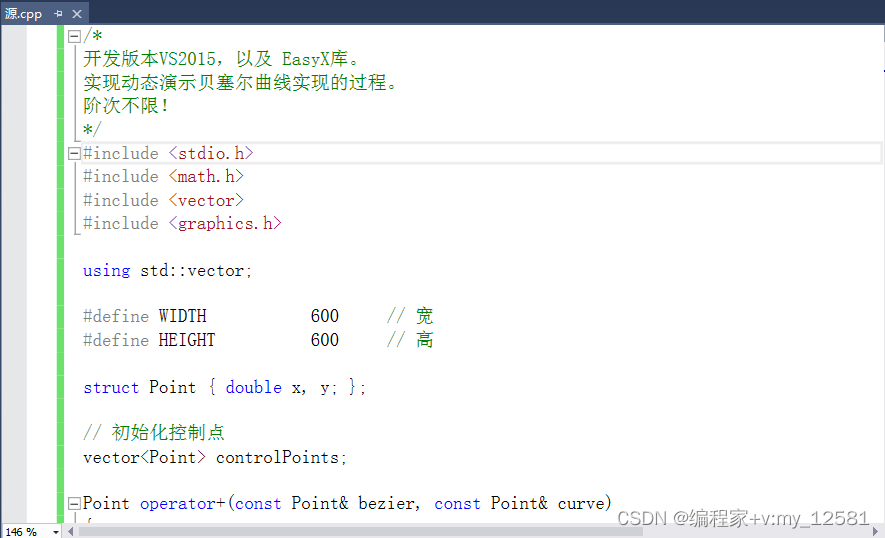 本文介绍如何利用C语言和EasyX库在VS2015中绘制动态的高阶贝塞尔曲线。详细讲解了代码实现过程,并提供了源代码获取途径。