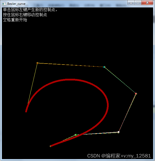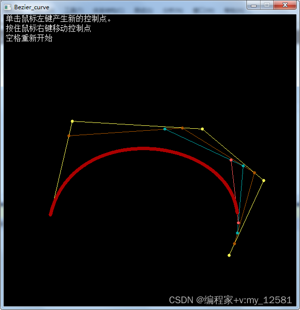 计算机图形学中贝塞尔曲线的绘制。使用的开发软件及版本为VS2015,以及 EasyX库。实现动态演示贝塞尔曲线实现的过程,且阶次不限!