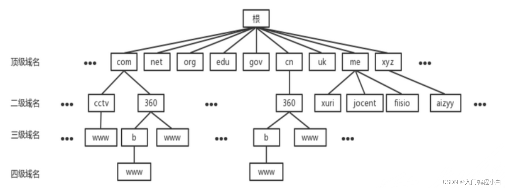 像之前讲过的Linux目录结构一样,现代因特网也采用层次树状结构的命名方法,每一个与因特网连接的主机都有一个唯一的层次结构名字,称为域名。域名的层次树状结构如图。