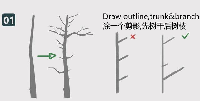 Draw outline,trunk&branch 涂一个剪影,先树干后树枝