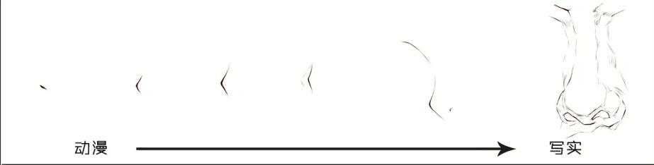 首先在进行赛璐璐上色的工作之前,先确定鼻子的轮廓,透视及结构是否正确,且角色年龄会一定影响鼻子的外观,尤其在人物头部动态较大的情况下。由于动漫与写实的画风相距较远,且动漫比较简单,甚至以点状的形式出现,具体变化请看下图。