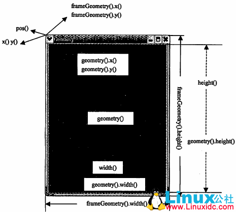 x(),y()和pos()函数都是获得整个窗体左上角的坐标位置。而frameGeometry()与geometry()相对应,frameGeometry()是获得整个窗体的左上顶点和长,宽值,而geometry()函数获得的是窗体内中央区域的左上顶点坐标以及长,宽值。直接调用width()和height()函数获得的是中央区域的长和宽的值。