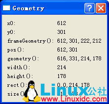 在实例中,分别调用了x(),y(),frameGeometry(),pos(),geometry(),width(),height(),rect(),size()几个函数,这几个函数均是QWidget提供的。当改变对话框的大小,或移动对话框时,调用各个函数所获得的信息显示也相应地发生变化,从变化中可得知各函数之间的区别。