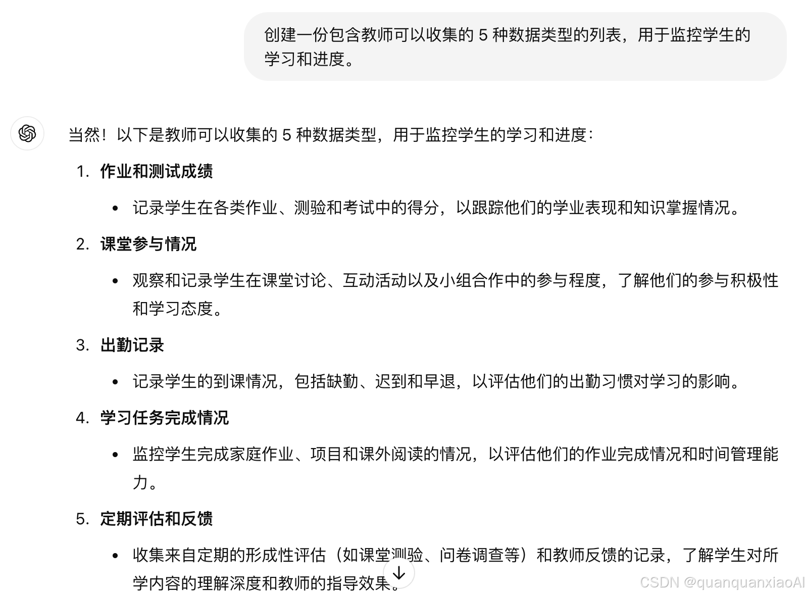 - 创建一份包含教师可以收集的 5 种数据类型的列表,用于监控学生的学习和进度。