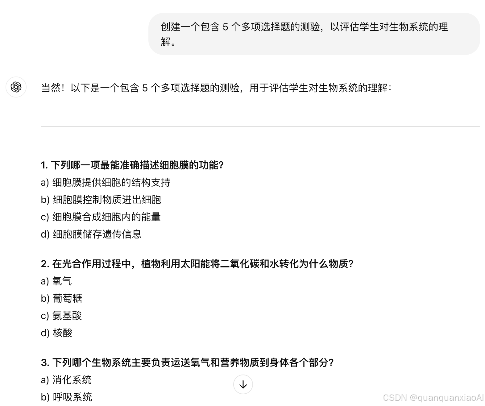 - 创建一个包含 5 个多项选择题的测验,以评估学生对 [所教授概念] 的理解。