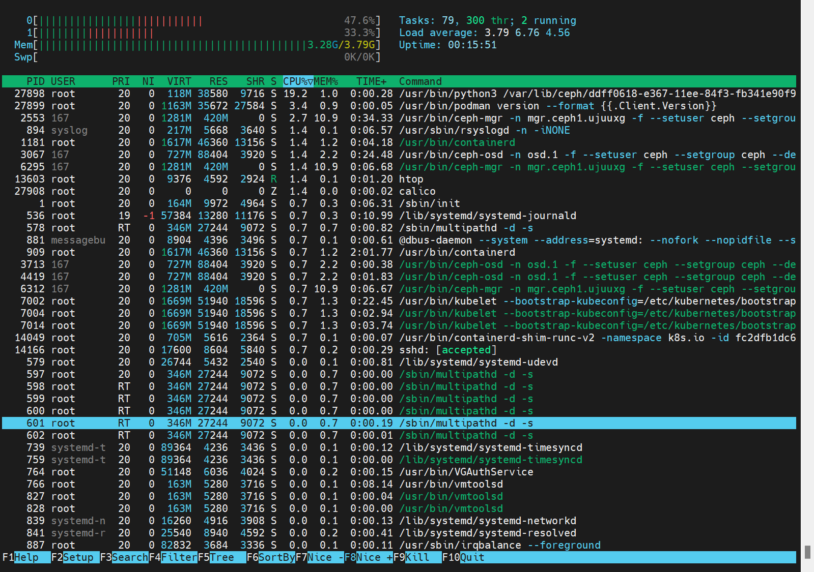 3、node上查看k8s+ceph的CPU,内存占用,管理界面要占4G内存+2个CPU。(每个OSD都应该分配2个CPU)