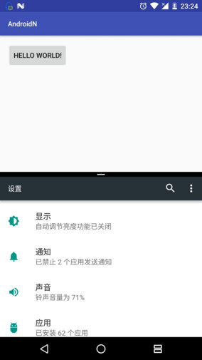 运行 Android N 的手机和平板电脑上,用户可以并排运行两个应用,或者处于分屏模式时一个应用位于另一个应用之上。用户可以通过拖动两个应用之间的分隔线来调整应用。在Android TV 设备上,应用可以将自身置于画中画模式,从而让它们可以在用户浏览或与其他应用交互时继续显示内容。