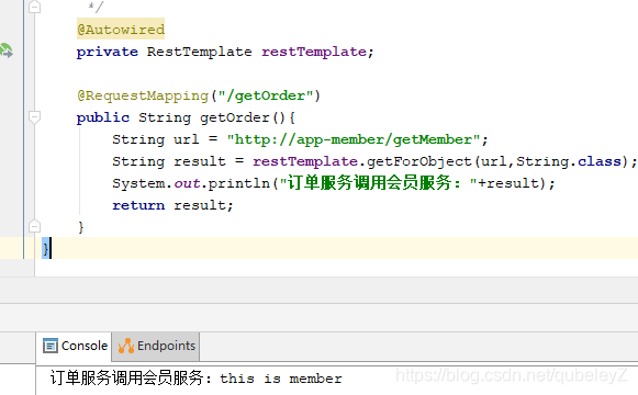 我们在getOrder中尝试使用RestTemplate来调用会员服务。