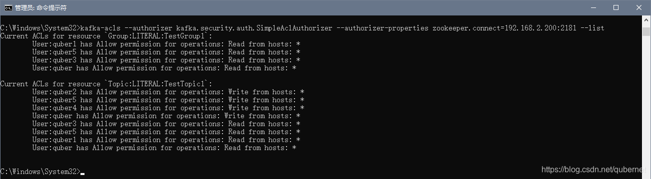 .\bin\windows\kafka-acls.bat --authorizer kafka.security.auth.SimpleAclAuthorizer --authorizer-properties zookeeper.connect=192.168.2.200:2181 --list --topic TestTopic1
